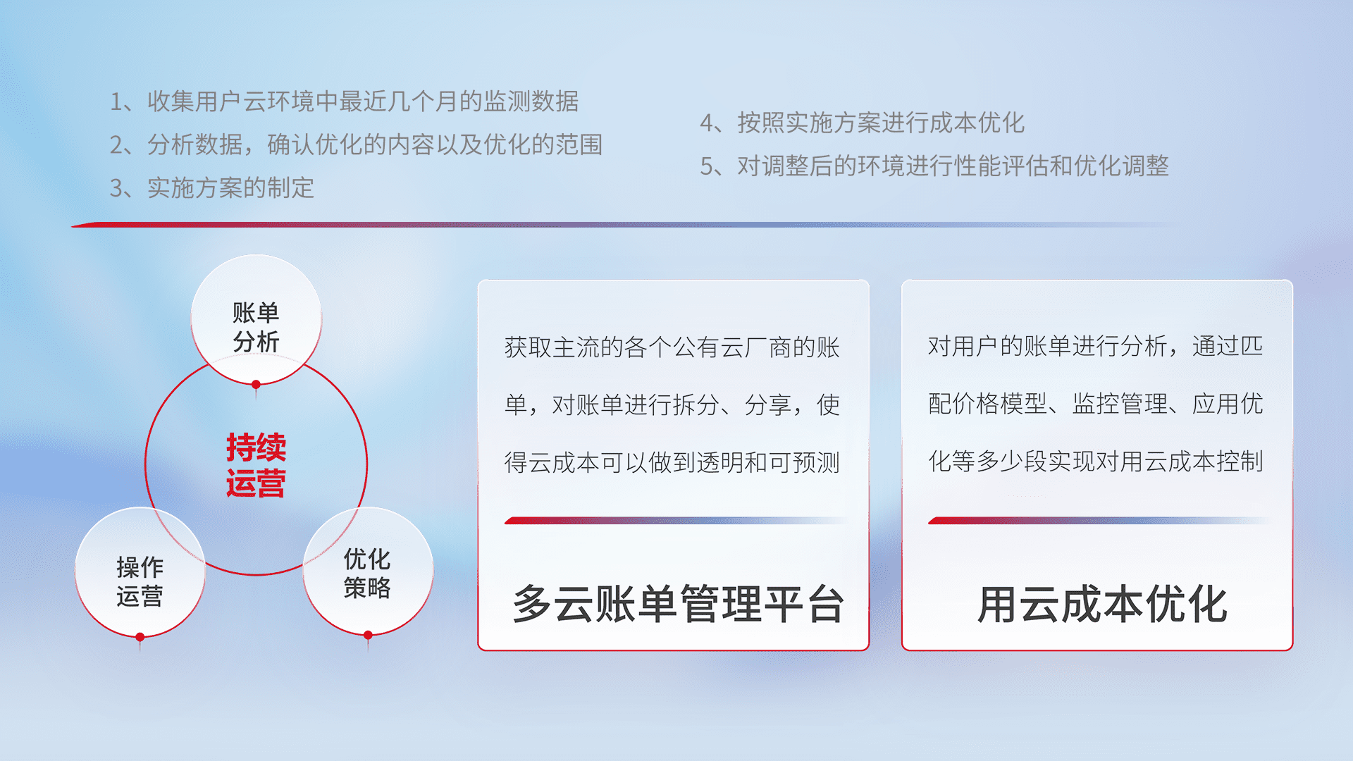通过多云纳管,,以统一的资源数据模型把客户的云资源进行抽象和封装,,进而实现对多云资源的统一操作,,,,保障云资源管理的可靠性、、、、稳定性与可用性。。。量身定制化运维内容,,,配置、、、、开发运维、、补丁管理、、备份、、、监控、、认证和访问管理、、、、审计和日常巡检等,,,保障在用云过程中的可靠度,,稳定度以及高可用率。。。。